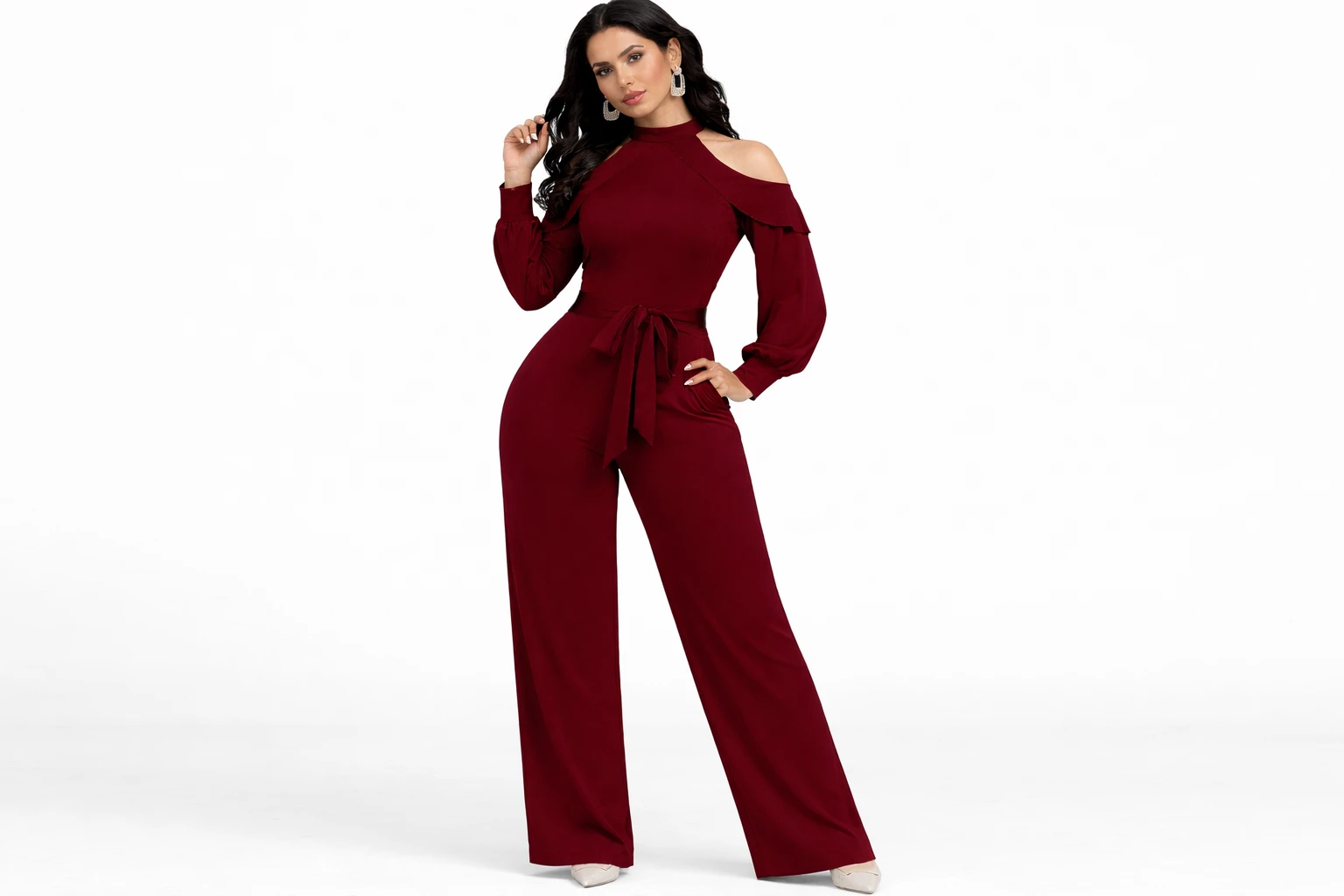 This deep burgundy jumpsuit is all about confidence and clean lines. The cold-shoulder neckline adds just the right amount of edge, while the cinched waist and flowing wide legs create a sleek, elongated silhouette. It’s a standout piece that feels powerful yet polished—perfect for evening events, date nights, or any moment that calls for effortless sophistication.