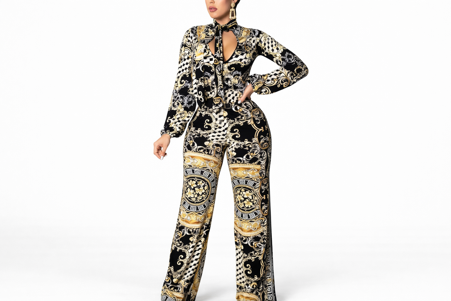 This black-and-gold baroque jumpsuit is pure statement dressing. The intricate print instantly gives high-fashion energy, while the tailored fit and wide-leg cut create a sleek, confident silhouette. Finished with a dramatic neckline and bold gold accents, it’s the kind of piece that turns heads at evening events, upscale dinners, or anywhere you want to bring unapologetic glamour into the room.