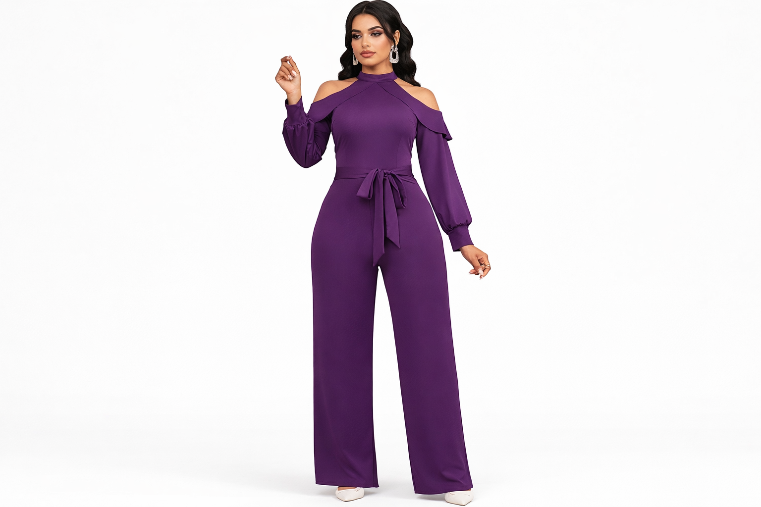 This rich purple jumpsuit is the perfect mix of elegance and confidence. The cold-shoulder design adds a subtle hint of drama, while the cinched waist and wide-leg silhouette create a beautifully flattering shape. It’s the kind of piece that instantly elevates your look—ideal for dinners, events, or anytime you want to make a bold yet polished statement without trying too hard.