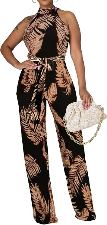 This tropical-print halter jumpsuit is the definition of effortless summer glam. The black base paired with warm, palm-leaf detailing gives it that perfect balance of bold and elegant, while the cinched waist and wide-leg silhouette flatter in all the right places. It’s the kind of piece that works just as well for a vacation dinner as it does for a rooftop night out—just add gold hoops, a textured clutch, and let the outfit do all the talking.
